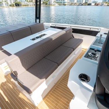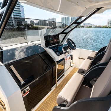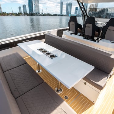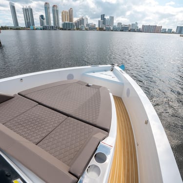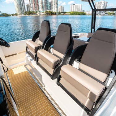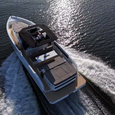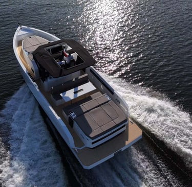 Rendimiento: Con una eslora de 9,90 metros y una manga de 3,20 metros, el De Antonio D32 está propulsado por dos motores Yamaha V6 de 300 CV cada uno, alcanzando una velocidad máxima de 50 nudos y una velocidad de crucero de 30 nudos, permitiéndote explorar las islas con rapidez y estilo.