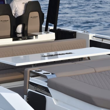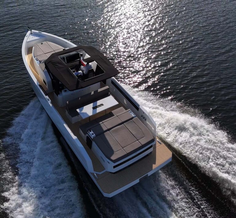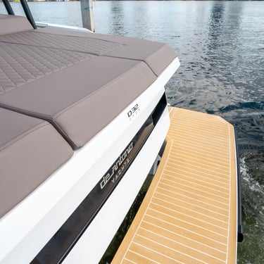 Diseño exterior: El De Antonio D32 presenta líneas modernas y deportivas, con una cubierta walk-around que ofrece amplios espacios y comodidad. Su diseño de casco en V garantiza una navegación estable y eficiente.