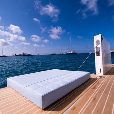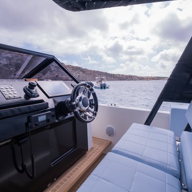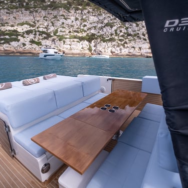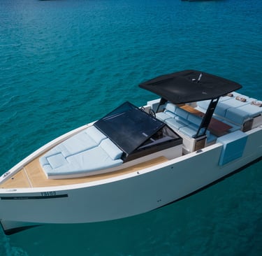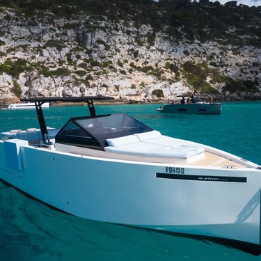 Rendimiento: Con una eslora de 9,80 metros y una manga de 3,40 metros, el De Antonio D34 Cruiser está propulsado por dos motores fuera de borda Mercury de 350 CV cada uno, alcanzando una velocidad máxima de 45 nudos y una velocidad de crucero de 27 nudos, permitiéndote explorar las islas con rapidez y estilo.