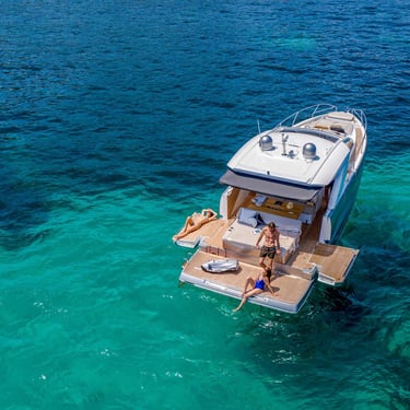 Diseño exterior: El Jeanneau DB43 presenta líneas modernas y deportivas, con amplias zonas de solárium en la proa y la popa, ideales para relajarse bajo el sol ibicenco. Su plataforma de baño facilita el acceso al mar y a actividades acuáticas.