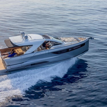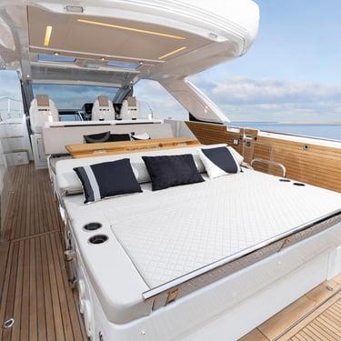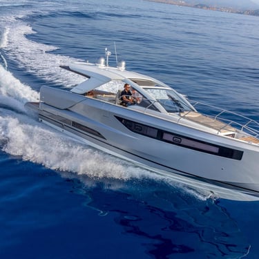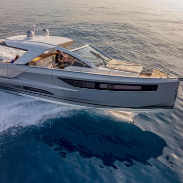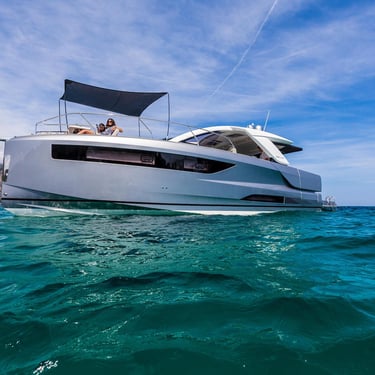 Rendimiento: Con tres potentes motores fuera borda Mercury Verado de 350 CV cada uno, el Jeanneau DB43 alcanza una velocidad máxima de 40 nudos y una velocidad de crucero de 30 nudos, permitiéndote explorar las islas con rapidez y estilo.