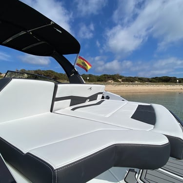Diseño exterior: La Monterey 278SS presenta líneas modernas y deportivas, con amplias zonas de solárium en la proa y la popa, ideales para relajarse bajo el sol ibicenco. Su plataforma de baño facilita el acceso al mar y a actividades acuáticas.