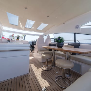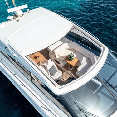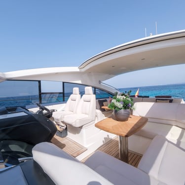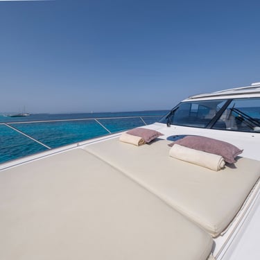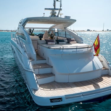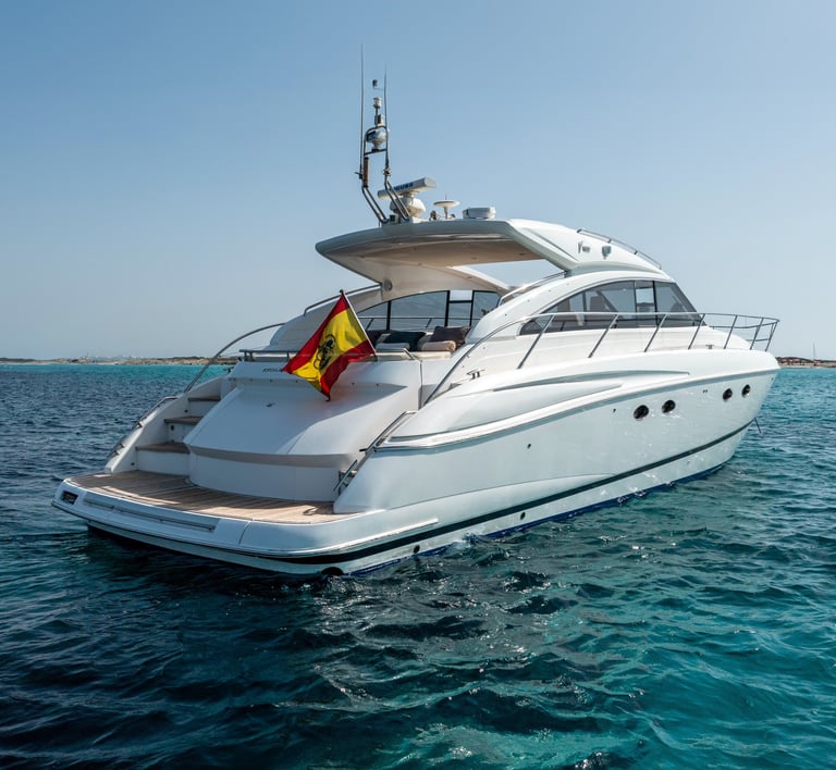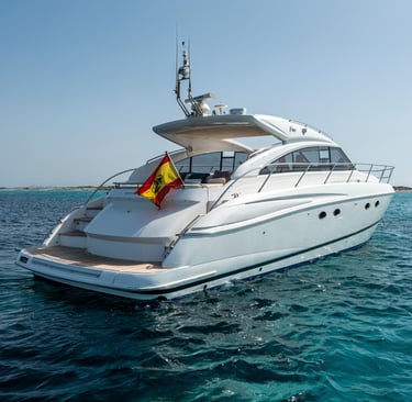 Diseño exterior: El Princess V54 presenta líneas modernas y deportivas, con amplias zonas de solárium en la proa y la popa, ideales para relajarse bajo el sol ibicenco. Su plataforma de baño facilita el acceso al mar y a actividades acuáticas.
